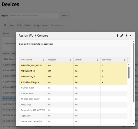 A workstation is always viewed in the context of a device and a device might be linked to many work centres. The list could be very long. You can now order the list of work centres, by dragging and dropping, so that the most important ones can be displayed at the top of the dropdown list. Note that the Default work centre will always be shown at the top of the list and the rest can be sequenced below it.