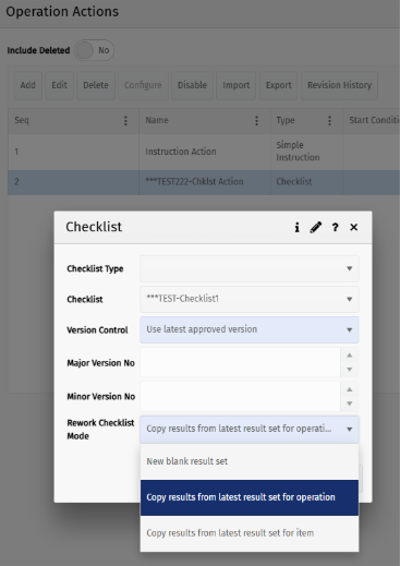 Example of copying results set for operation: A checklist is completed in a production operation and there is an issue, so it is routed to a rework operation to be fixed then back to the original production operation for rechecking. In this scenario you may want to copy and display to the operator the original non-conforming results recorded in that operation, allowing the operator to record results that are now compliant.
