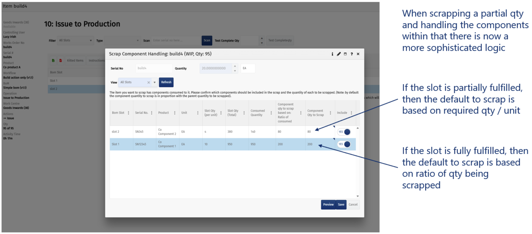 The enhancement provides more accurate and sensible handling of component consumption and scrapping, especially in scenarios where builds are ongoing and not all slots are fully satisfied.