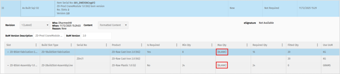 In the eCHR, where the information is blank by design and cannot be changed by the operator, e.g., the entity has been checked and approved as part of the definition of manufacture (e.g., no upper / lower tolerance on an approved BoM slot) this can be automatically populated with ‘[BLANK]’ in the eCHR as of 9.3.
