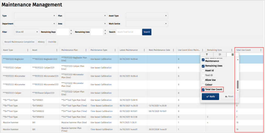 Show tool total use count in maintenance management grid as hidden field