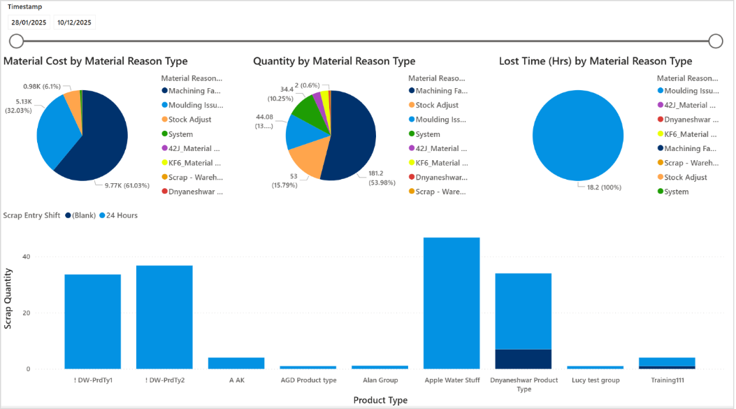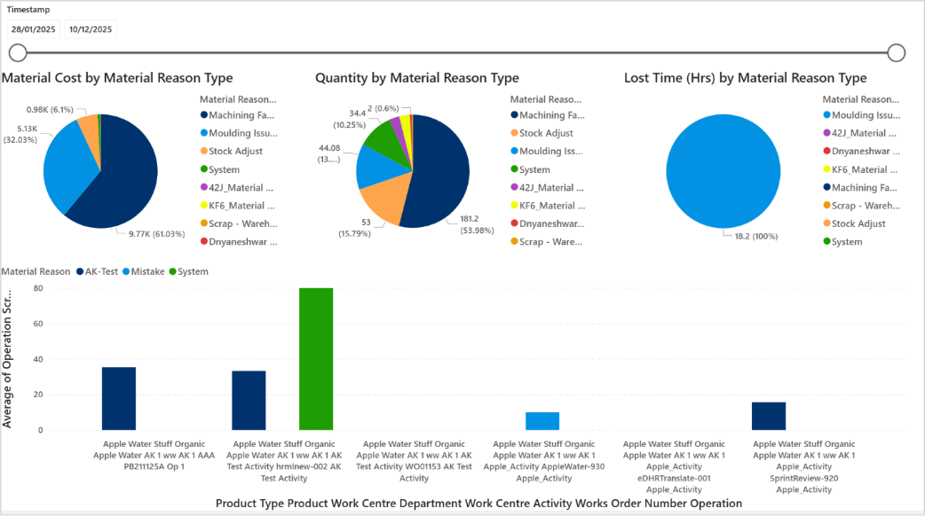 The Scrap Analysis report was enhanced to view WIP and component scrap percentage by works order with reason codes, and it filters by scrap entry timestamp, scrap entry shift, scrapped product name, works order number, scrap type, Operation Scrap %, Job Scrap %.