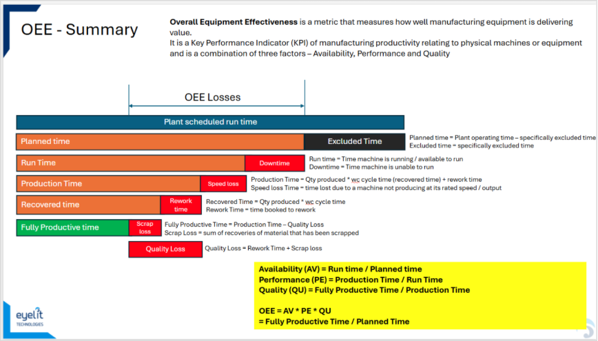 Overall Equipment Effectiveness (OEE) calculations are based on the calculations described in the image below.