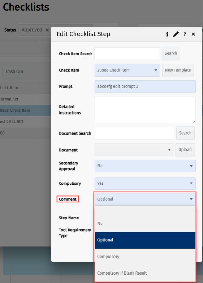 New configuration options have been added for checklist steps, allowing comments to be set as not needed, optional, or compulsory.