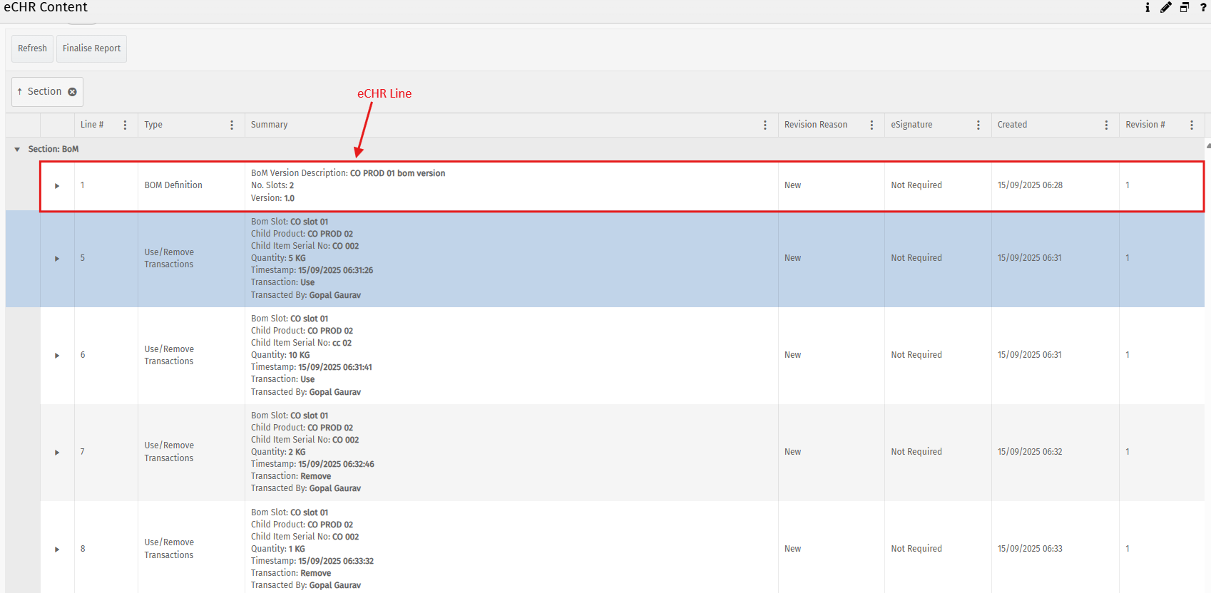 Expand the eCHR Line to see the detailed information. A line consists of a summary and detailed section.