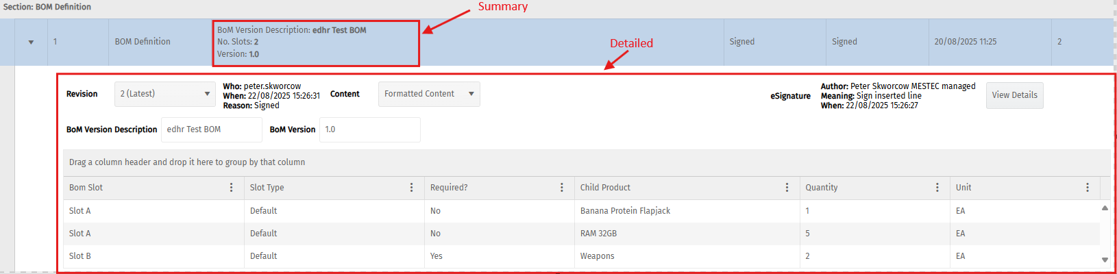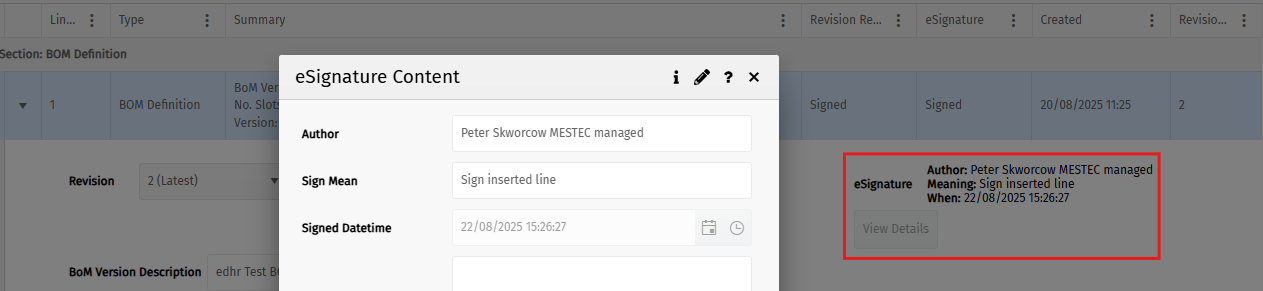 - The View Details on lines that were signed brings up the eSignature Content pop-up with information about the signature.