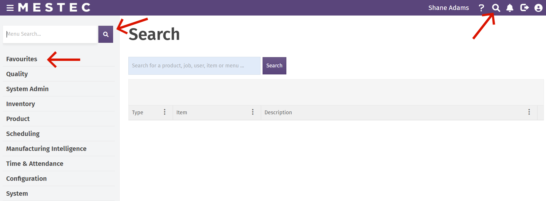 Clicking the search icon in the top right menu opens the Search page. Searches done here are system wide. For example, you could search for a user by name which will return results. This will not work in the menu search.