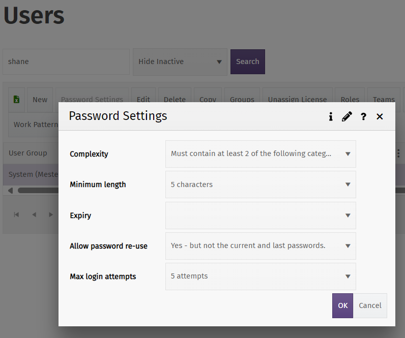 Password complexity rules are configured in the Users screen. Here, the password for the user can be reset.