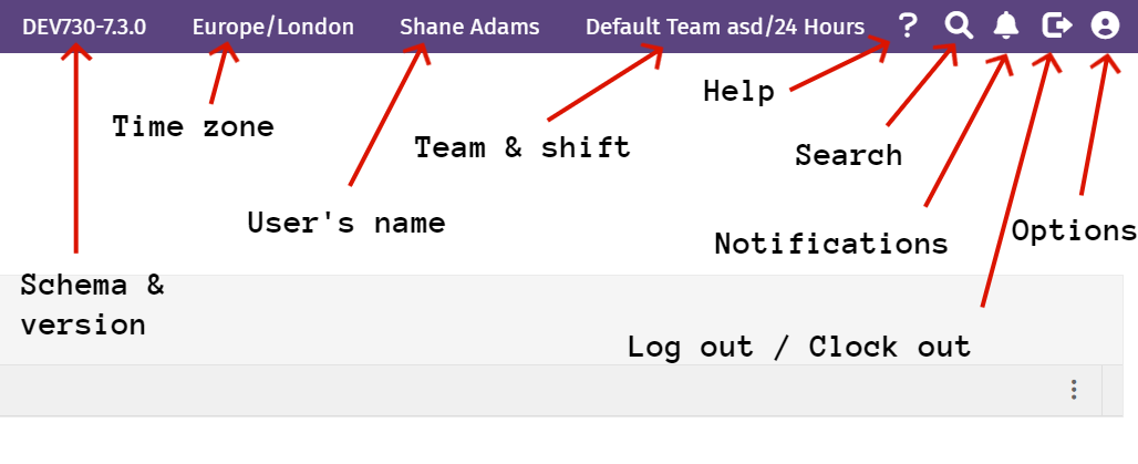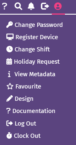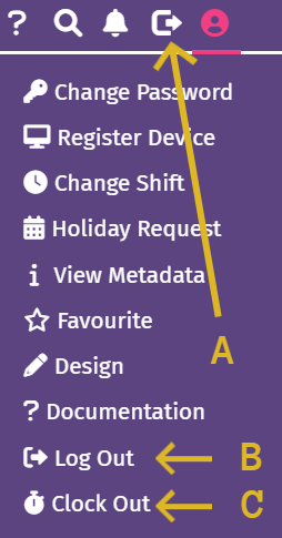 - Log out/Clock out: Click the icon with the arrow to log out or clock out of the system.