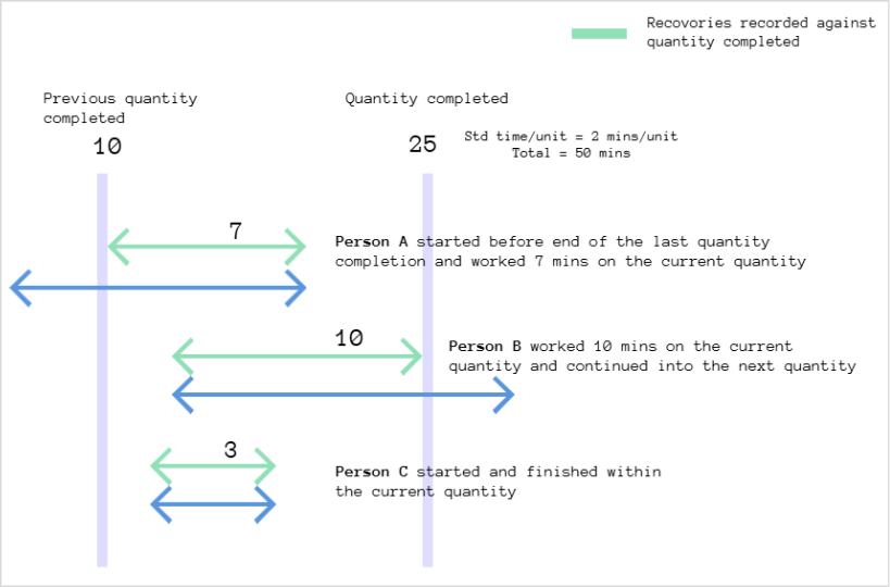 The image below describes how recoveries are shared where 3 people worked a total of 20 minutes on the quantity completed.