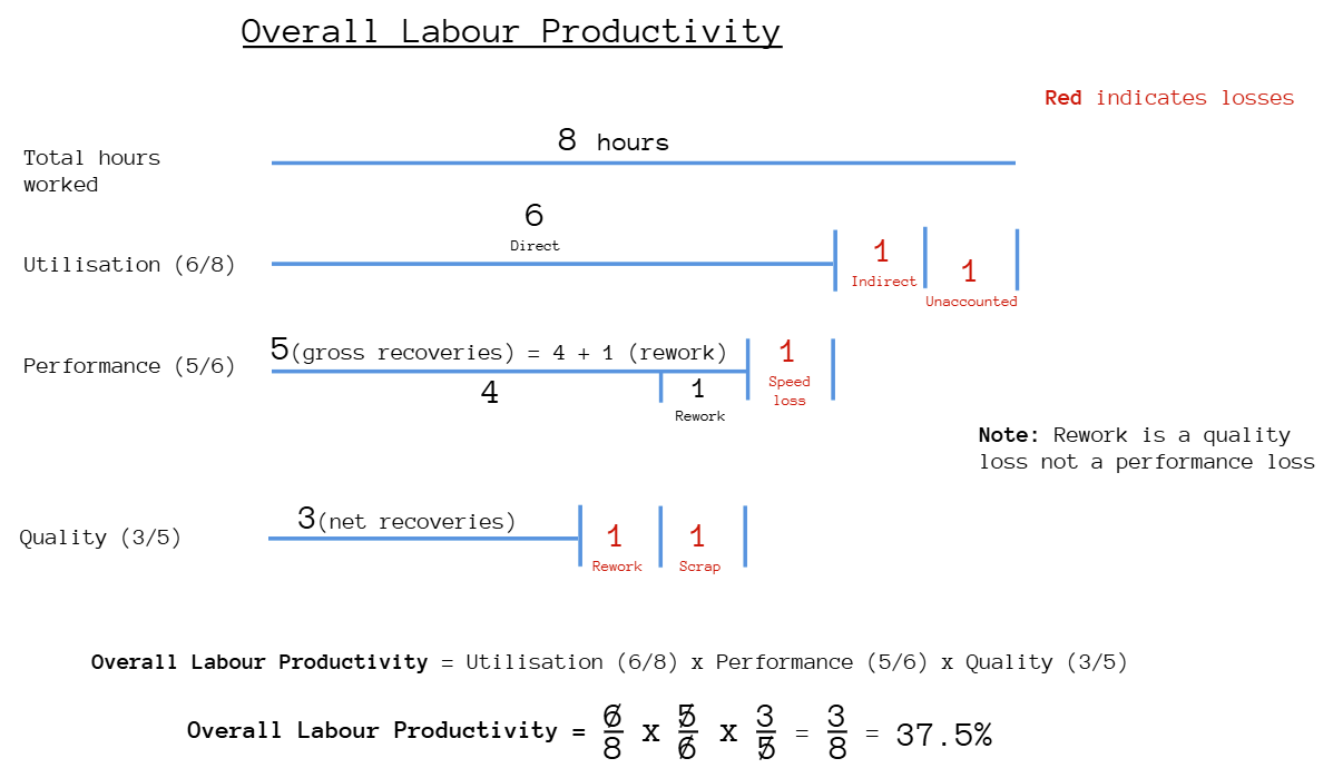 - Quality: The proportion of recovered hours that are lost as a result of rework and scrap.