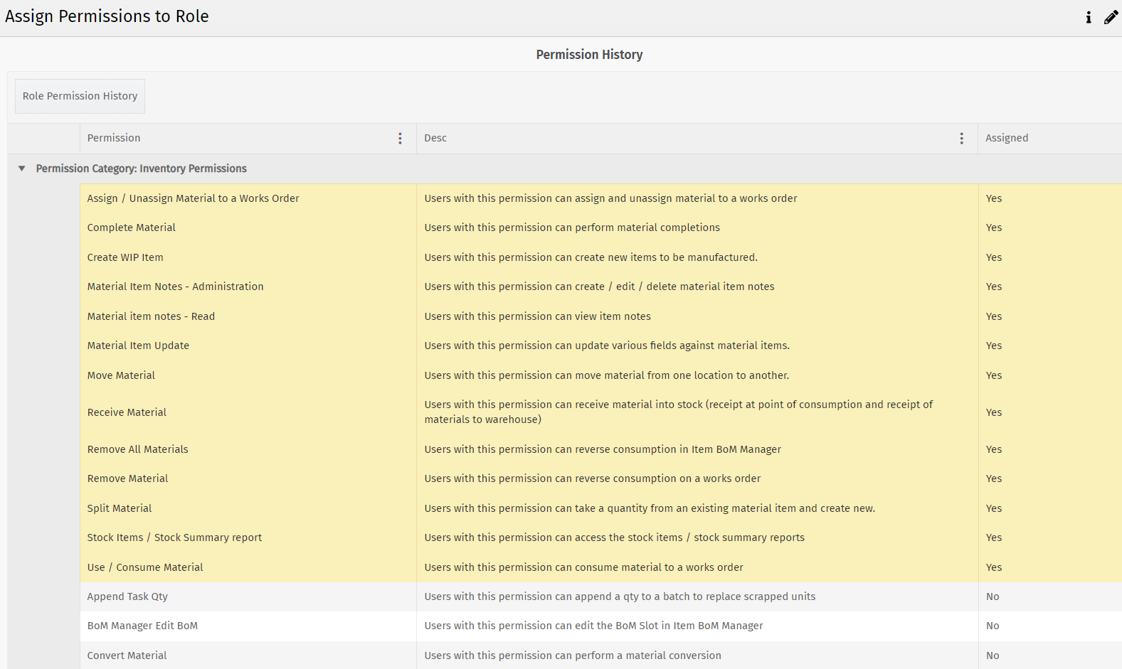 - The rows of the added permission will turn yellow, and the Assigned column will show Yes.