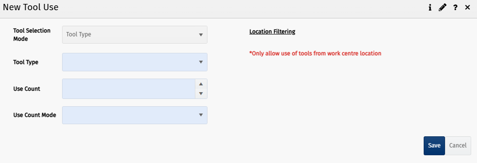 - Location Filtering: Not configurable and displays the following message: "*Only allow use of tools from the Work Centre location".