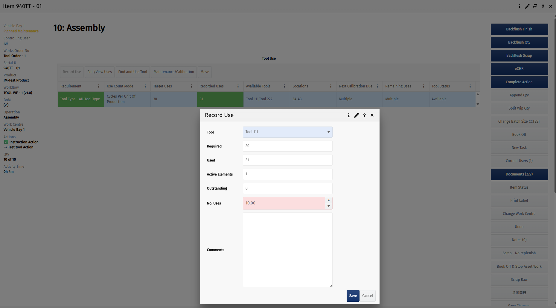The pop-up allows the operator to select a valid tool and record how many times it has been used. The No. Uses numeric box defaults to the full/outstanding uses to fulfil the requirement, but operators can override this (for example, if you have two operators using two different tools for the same job or a tool breaks/runs out of calibration and needs to be swapped halfway).
